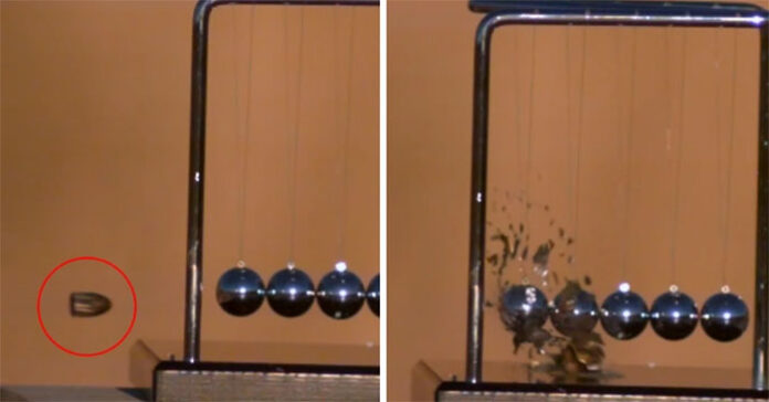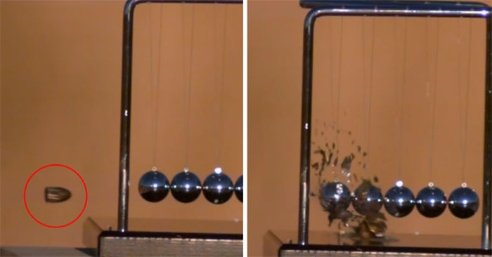 Kênh YouTube The Slowmo Guys đã đăng tải một video ghi lại cảnh một viên đạn súng lục 9mm được bắn thẳng vào hệ thống con lắc Newton đang đặt trên bàn. Video được ghi lại bằng camera tốc độ cao Phantom TMX 7510.