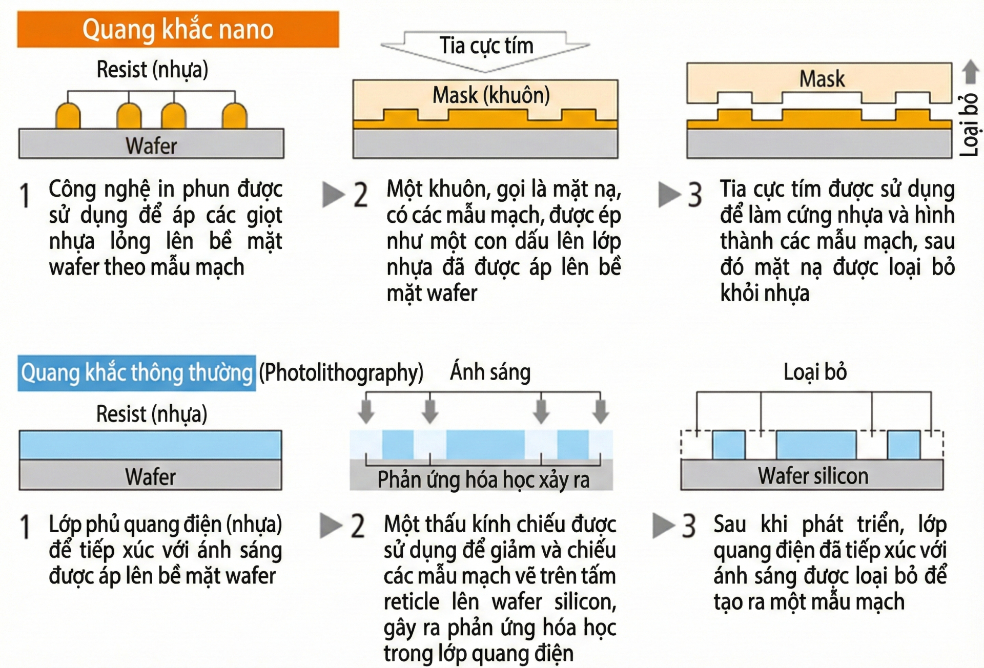 Có thể nói thay vì dùng ánh sáng khắc từng đường nét trên con chip, công nghệ sản xuất chip của Nhật Bản tương tự như việc tạo khuôn in và đóng dấu nó lên tấm wafer