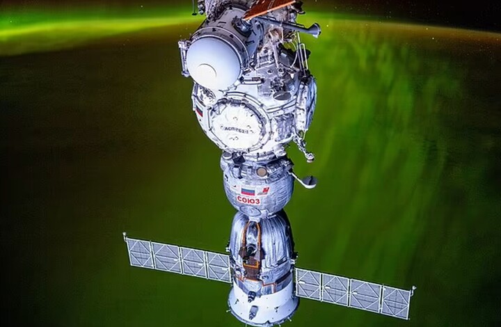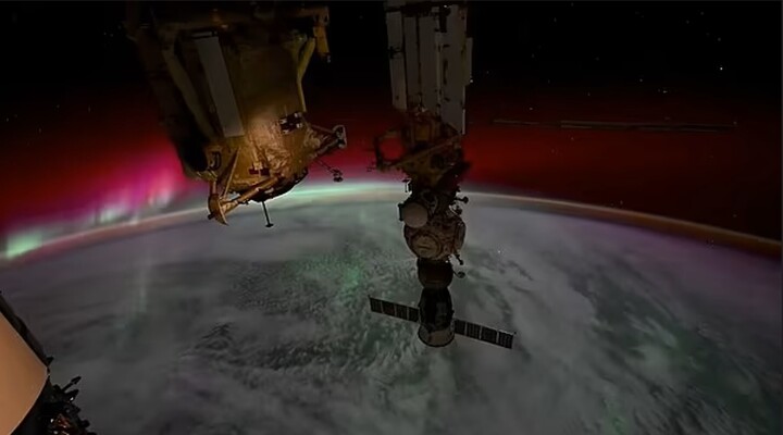 “Video tua nhanh cảnh mặt trăng lặn xuống những dải cực quang đỏ và xanh lá cây, tiếp theo là cảnh mặt trời mọc chiếu sáng tàu Soyuz bằng ánh sáng xanh nhạt” , ông Dominick viết trong chú thích video mới nhất của mình.