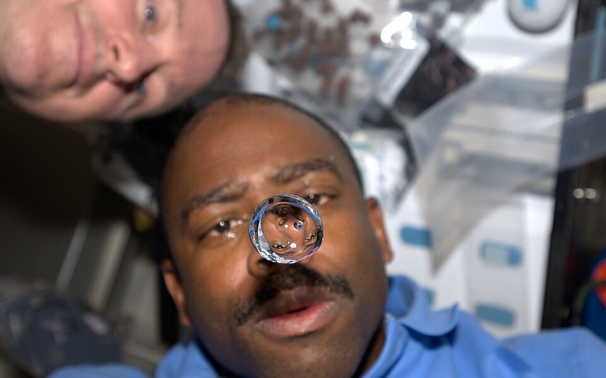 Phi hành gia Leland Melvin, chuyên gia sứ mệnh STS-129, ngắm nhìn một bong bóng nước lơ lửng giữa không gian trong tàu con thoi Atlantis – Ảnh: NASA.